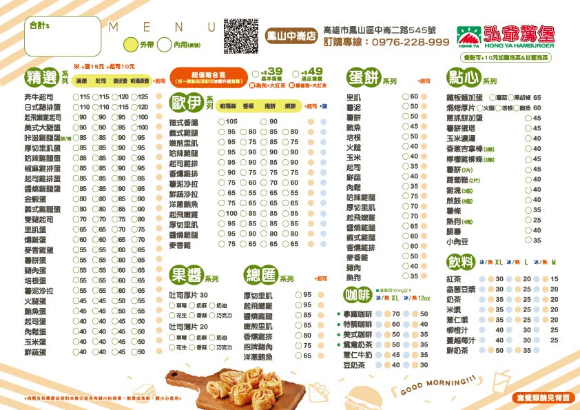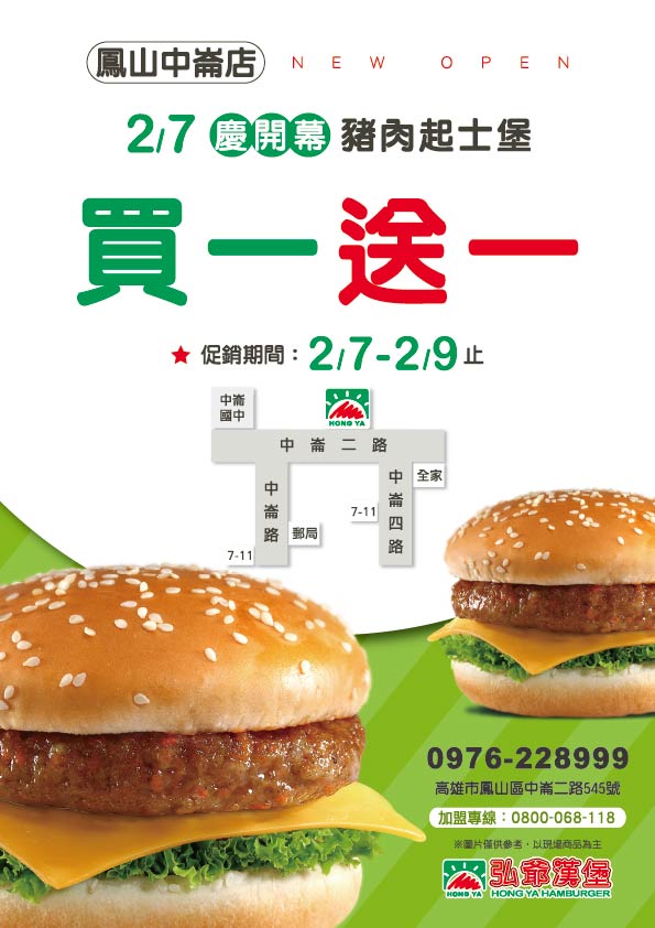 最新消息 下一則 弘爺漢堡【和社店】新開幕|1/29(四)豬肉起士堡買一送一! 返回列表 Facebook Twitter Google plus 門市開幕、菜單 弘爺漢堡【鳳山中崙店】新開幕|02/07-02/9豬肉起士堡買一送一! 2026-02-05 弘爺漢堡 鳳山中崙店 盛大開幕 🎉 開幕限定優惠 - 豬肉起士堡買一送一 🎉 活動期間:2/7-2/9 限時3天! 🔥 開幕慶典優惠活動 🎊 開幕優惠活動內容 ⭐ 促銷期間:2/7-2/9止 🍔 豬肉起士堡 買一送一 現煎豬肉排搭配香濃起士 開幕特惠超級划算! 💥限量供應售完為止💥 📍 門市資訊 🏠 地址:高雄市鳳山區中崙二路545號 📞 訂餐專線:0976-228999 🎊 慶開幕:2/7 正式開幕 📋 完整菜單價格表 🌅 套餐系列 Good Morning 🍔 完整菜單 (多樣選擇滿足你) 🏙️ 鳳山區在地推薦必點 🍔 豬肉起士堡 - 開幕期間 買一送一 🥪 豐盛早餐組合 - 營養滿分開啟美好一天 🥤 多樣飲品選擇 - 冰熱任選搭配最對味 ☕ 現調咖啡 - 提神醒腦最佳選擇 📱 聯絡我們 外送服務請洽門市 | 可電話預訂 追蹤弘爺漢堡官方社群,掌握最新優惠資訊! 💼 加入弘爺漢堡,開間讓你賺錢的又早早下班的店 加盟專線:0800-068-118 📘 Facebook 📷 Instagram ※ 依店家實際販售價格及商品為主 商品內容與價格如有異動,以門市現場公告為準 🎊 歡迎光臨弘爺漢堡鳳山中崙店 🎊 鳳山鄉親們!期待為您提供最優質的美式餐飲體驗! 返回列表 Facebook Twitter Google plus