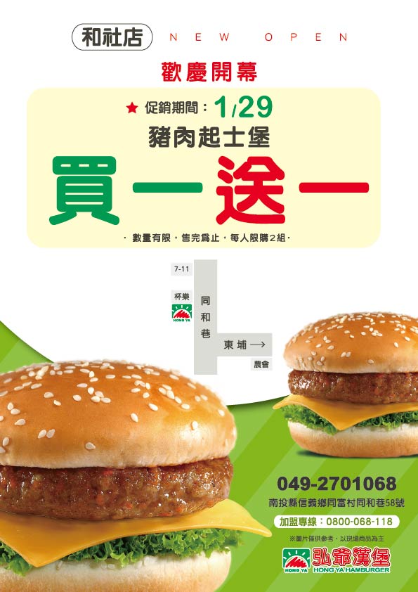 最新消息 下一則 2026 幸福早餐5星之旅 返回列表 Facebook Twitter Google plus 門市開幕、菜單 弘爺漢堡【和社店】新開幕|1/29(四)豬肉起士堡買一送一! 2026-01-27 弘爺漢堡 和社店 盛大開幕 🎉 開幕限定優惠 - 豬肉起士堡買一送一 🎉 活動期間:1/29 (四) 限時1天! 🔥 開幕慶典優惠活動 🎊 開幕優惠活動內容 ⭐ 促銷期間:1/29(四) 🍔 豬肉起士堡 買一送一 現煎豬肉排搭配香濃起士 開幕特惠超級划算! 💥限量供應售完為止💥 📍 門市資訊 🏠 地址:南投縣信義鄉同富村同和巷58號 📞 訂餐專線:049-2701068 🎊 慶開幕:1/29 正式開幕 📋 完整菜單價格表 🌅 套餐系列 Good Morning 🍔 完整菜單 (多樣選擇滿足你) 🏙️ 信義鄉在地推薦必點 🍔 豬肉起士堡 - 開幕期間 買一送一 🥪 豐盛早餐組合 - 營養滿分開啟美好一天 🥤 多樣飲品選擇 - 冰熱任選搭配最對味 ☕ 現調咖啡 - 提神醒腦最佳選擇 📱 聯絡我們 外送服務請洽門市 | 可電話預訂 追蹤弘爺漢堡官方社群,掌握最新優惠資訊! 💼 加入弘爺漢堡,開間讓你賺錢的又早早下班的店 加盟專線:0800-068-118 📘 Facebook 📷 Instagram ※ 依店家實際販售價格及商品為主 商品內容與價格如有異動,以門市現場公告為準 🎊 歡迎光臨弘爺漢堡和社店 🎊 信義鄉親們!期待為您提供最優質的美式餐飲體驗! 返回列表 Facebook Twitter Google plus