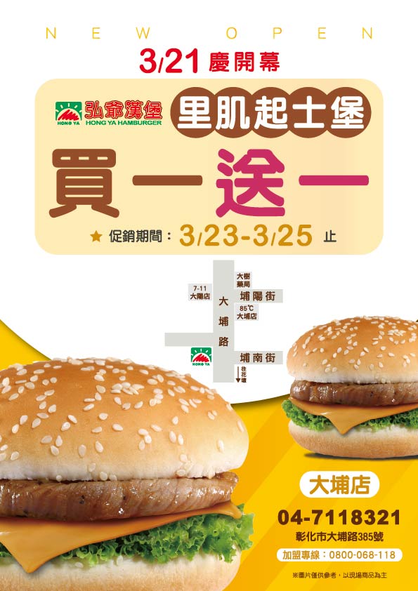 最新消息 下一則 弘爺漢堡【花蓮太魯閣店】新開幕|03/13-03/16豬肉起士堡特價19元! 返回列表 Facebook Twitter Google plus 門市開幕、菜單 弘爺漢堡【大埔店】新開幕|3/23-3/25 里肌起士堡買一送一! 2026-03-20 弘爺漢堡 大埔店 盛大開幕 🎉 開幕限定優惠 - 里肌起士堡買一送一 🎉 活動期間:3/23-3/25 限時3天! 🔥 開幕慶典優惠活動 🎊 開幕優惠活動內容 ⭐ 促銷期間:3/23-3/25止 🍔 里肌起士堡 買一送一 現煎豬肉排搭配香濃起士 開幕特惠超級划算! 💥限量供應售完為止💥 📍 門市資訊 🏠 地址:彰化市大埔路385號 📞 訂餐專線:04-7118321 🎊 慶開幕:3/21 正式開幕 📋 完整菜單價格表 🌅 套餐系列 Good Morning 🍔 完整菜單 (多樣選擇滿足你) 🏙️ 彰化市在地推薦必點 🍔 里肌起士堡 - 開幕期間 買一送一 🥪 豐盛早餐組合 - 營養滿分開啟美好一天 🥤 多樣飲品選擇 - 冰熱任選搭配最對味 ☕ 現調咖啡 - 提神醒腦最佳選擇 📱 聯絡我們 外送服務請洽門市 | 可電話預訂 追蹤弘爺漢堡官方社群,掌握最新優惠資訊! 💼 加入弘爺漢堡,開間讓你賺錢的又早早下班的店 加盟專線:0800-068-118 📘 Facebook 📷 Instagram ※ 依店家實際販售價格及商品為主 商品內容與價格如有異動,以門市現場公告為準 🎊 歡迎光臨弘爺漢堡大埔店 🎊 彰化市鄉親們!期待為您提供最優質的美式餐飲體驗! 返回列表 Facebook Twitter Google plus