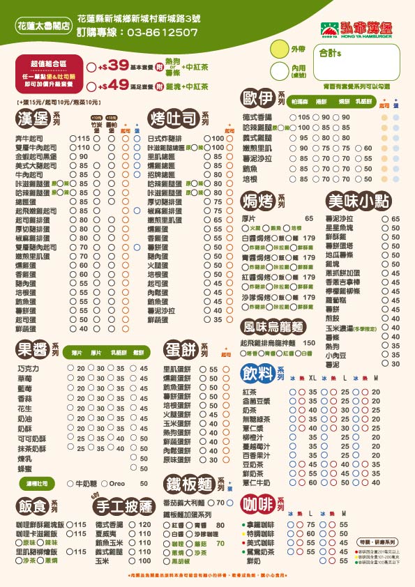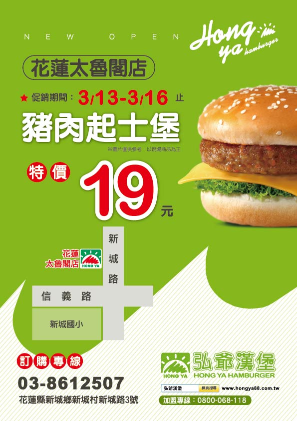 最新消息 下一則 弘爺漢堡【永康忠孝店】新開幕|03/13-03/16豬肉起士堡買一送一! 返回列表 Facebook Twitter Google plus 門市開幕、菜單 弘爺漢堡【花蓮太魯閣店】新開幕|03/13-03/16豬肉起士堡特價19元! 2026-03-11 弘爺漢堡 花蓮太魯閣店 盛大開幕 🎉 開幕限定優惠 - 豬肉起士堡特價19元 🎉 活動期間:3/13-3/16 限時4天! 🔥 開幕慶典優惠活動 🎊 開幕優惠活動內容 ⭐ 促銷期間:3/13-3/16止 🍔 豬肉起士堡 特價19元 現煎豬肉排搭配香濃起士 開幕特惠超級划算! 💥限量供應售完為止💥 📍 門市資訊 🏠 地址:花蓮縣新城鄉新城村新城路3號 📞 訂餐專線:03-8612507 🎊 慶開幕:3/13 正式開幕 📋 完整菜單價格表 🌅 套餐系列 Good Morning 🍔 完整菜單 (多樣選擇滿足你) 🏙️ 花蓮縣新城村在地推薦必點 🍔 豬肉起士堡 - 開幕期間 特價19元 🥪 豐盛早餐組合 - 營養滿分開啟美好一天 🥤 多樣飲品選擇 - 冰熱任選搭配最對味 ☕ 現調咖啡 - 提神醒腦最佳選擇 📱 聯絡我們 外送服務請洽門市 | 可電話預訂 追蹤弘爺漢堡官方社群,掌握最新優惠資訊! 💼 加入弘爺漢堡,開間讓你賺錢的又早早下班的店 加盟專線:0800-068-118 📘 Facebook 📷 Instagram ※ 依店家實際販售價格及商品為主 商品內容與價格如有異動,以門市現場公告為準 🎊 歡迎光臨弘爺漢堡花蓮太魯閣店 🎊 花蓮鄉親們!期待為您提供最優質的美式餐飲體驗! 返回列表 Facebook Twitter Google plus