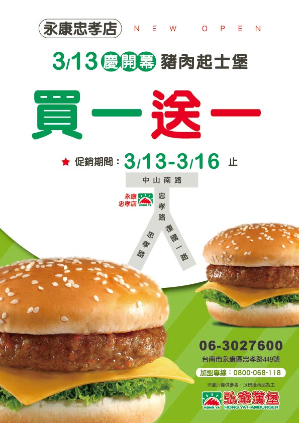 弘爺漢堡【花蓮太魯閣店】新開幕|03/13-03/16豬肉起士堡特價19元!